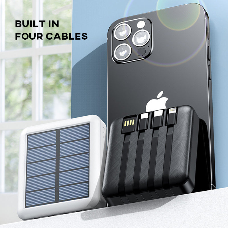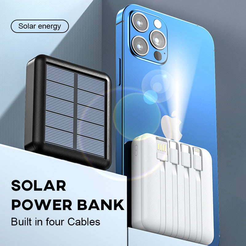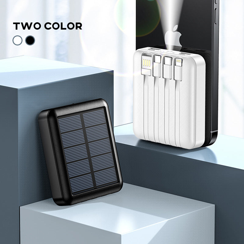 The Mini solar power bank comes with four lines, a bright LED flashlight and a lanyard.