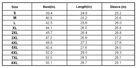 - Size: S, M, L, XL, 2XL, 3XL, 4XL, 5XL, 6XL, 7XL, 8XL