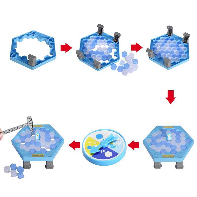 Enjoy an interactive board game with your kids in our penguin icebreaker game. The mechanics are simple. Just place the penguin on the ice (hex blocks) and break off the ice with the plastic hammers. Whoever drops the penguin loses.