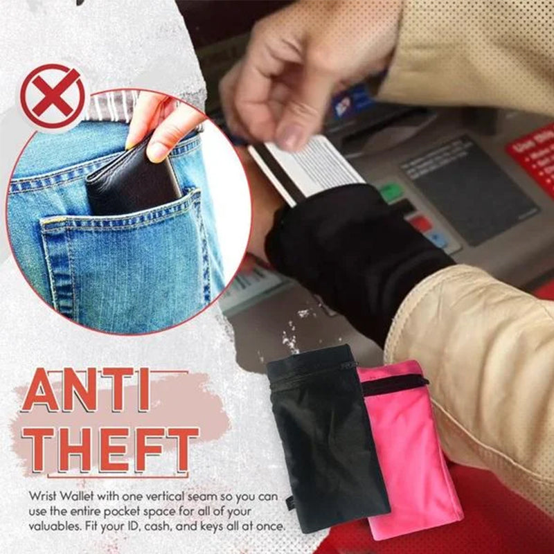 Mini zippered wrist pouch that allows you to carry all your valuable items without needing a bag or purse.