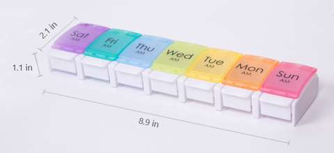 SPRING ASSISTED OPEN DESIGN. We use the latest design on this weekly pill organizer to achieve one-handed operation with the little rubber strips for the smart "lid spring open" feature. The lids are all beautifully colored and marked clearly with the date, everything is clear at a glance so you may find it easy to choose the pills you need. It's quite nice for easy daily dispensing and big enough to hold 8 fish oils or 12 large vitamins for each dose (size of each compartment: 1.3"x1.18"x0.82")