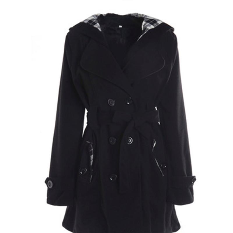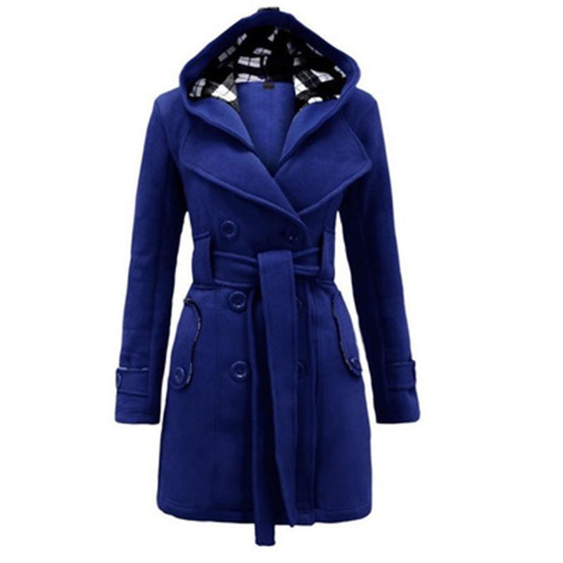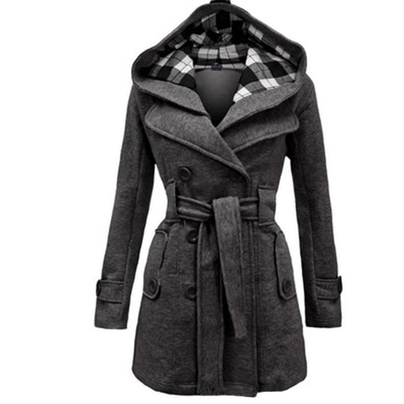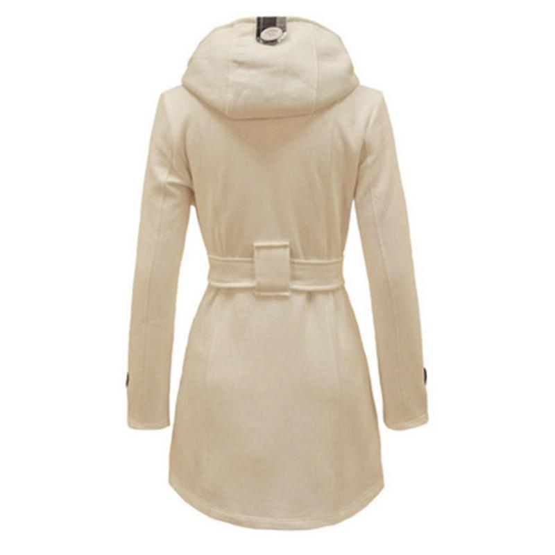 Women Double Breasted Slim Hoodie Solid Casual Long Pea Coat with Belt