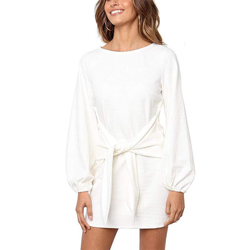 - This Style Has a Round Neckline, Full Length Lantern Sleeves, a Tie up Waist at the Front. Mini Length