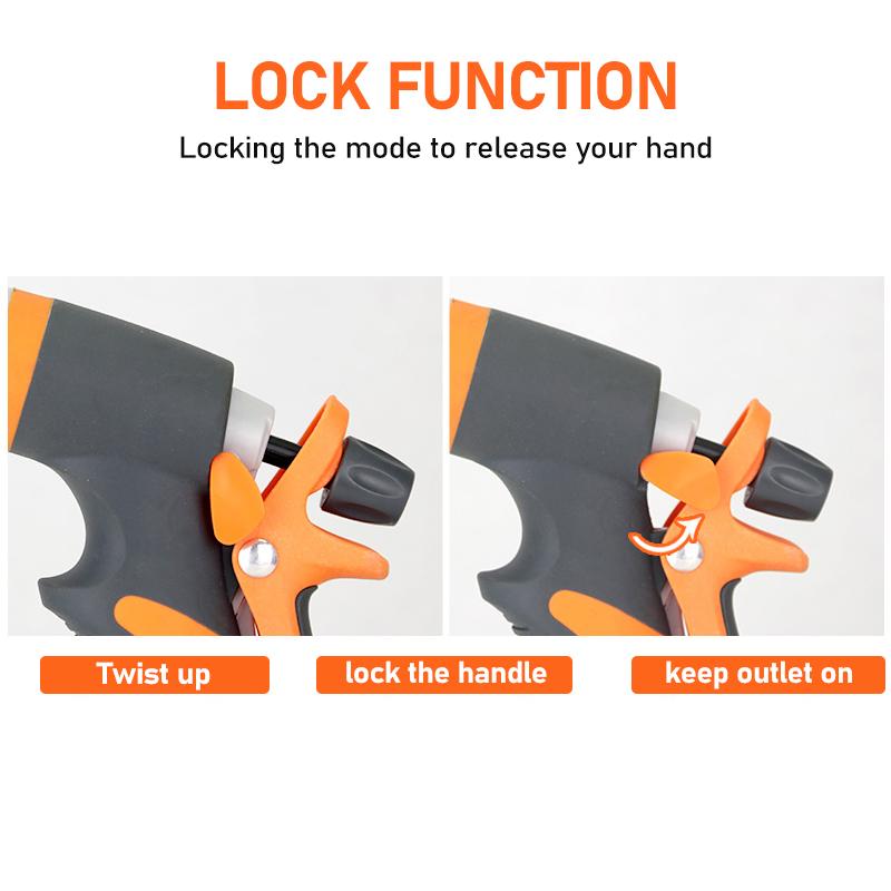 Unique Design--Garden hose nozzle has an orange locking lever handle top. If you need to lock the clip for a long time, you don't need to press it manually.